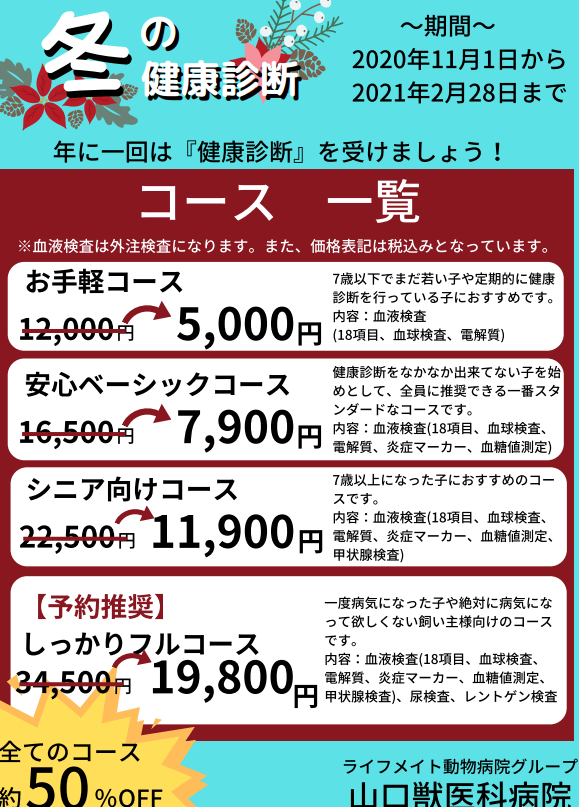11月1日から冬の健康診断キャンペーンが始まりました!今回通常の健康診断料金から約50%offとさせていただきます❣❣ 料金のメリット以外に健診のメリットは3つあると考えられています。1.病気を早期に見つけられる2.定期 […]