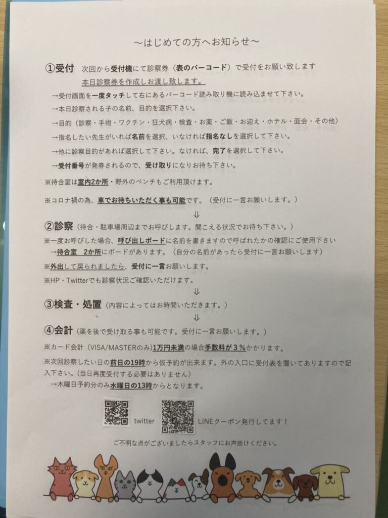 山口獣医科病院の管理人でございます。 待合での山口院内ルールを共有いたします。・予約順番票のルール・待合対応での共有事項・予約順番票で”診療”を抜いた順番でお呼びする診療項目(診察以外の項目)・猫の保護について※当院では […]